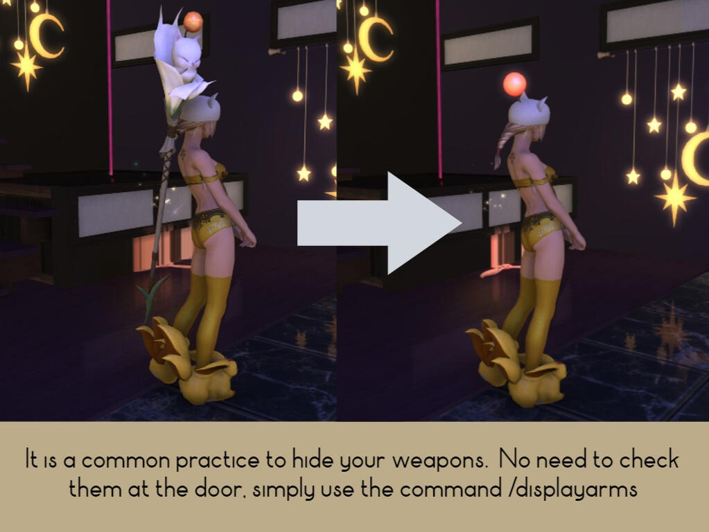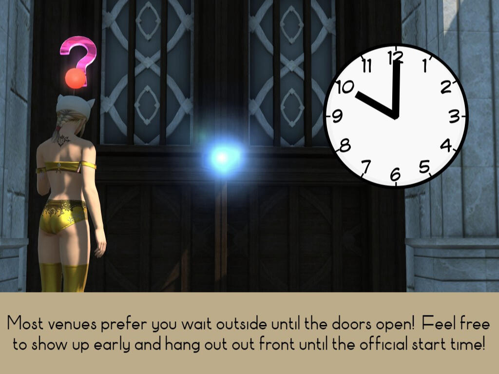 It is never our intention to include any credit information on this guide, as it is meant for the community, by the community. Our view is to remain as neutral as possible, not calling out any specific players, venues, Twitch stream, etc.This guide is by no means intended to, nor should be used as promotional material for any community/player driven content.If any player or venue names appear in screenshots, they are being used for example purposes only and are not intended as any promotion nor construed as sponsorship of this guide.If you feel there is any offending content present, please reach out to the only contact being listed here, which is by no means an endorsement nor promotion nor sponsorship of this guide:FFXIV: Hype Girl@Balmung