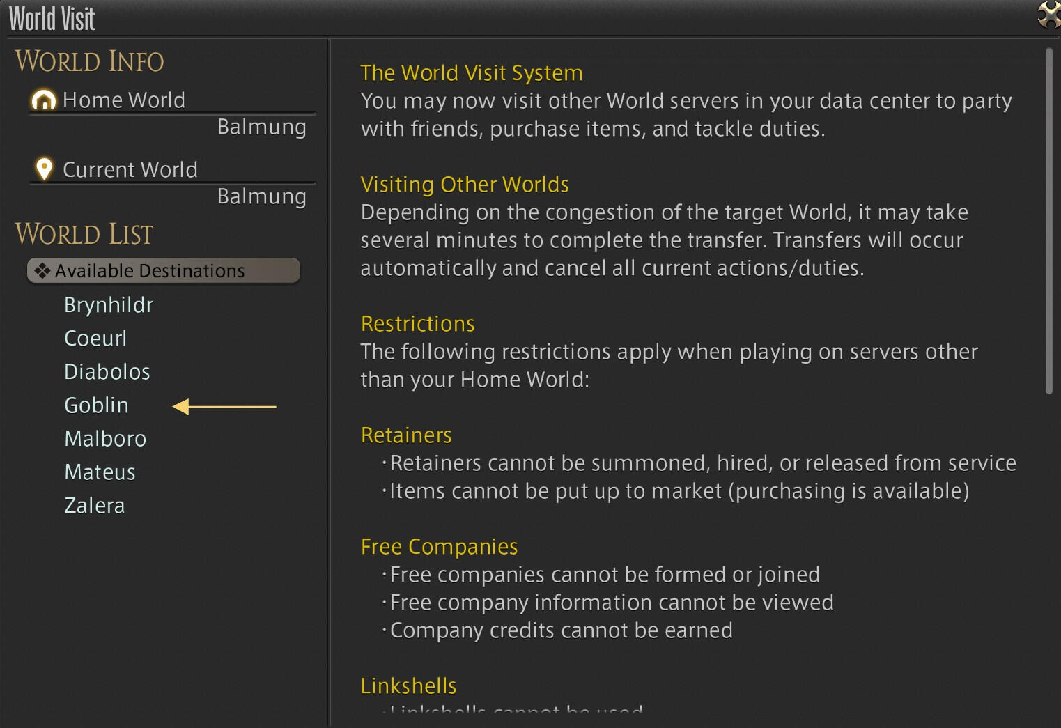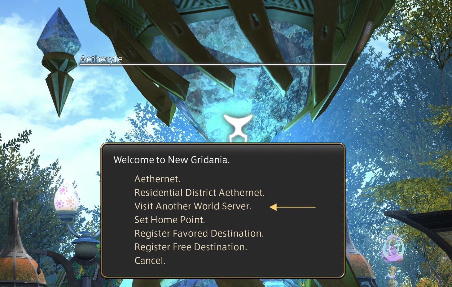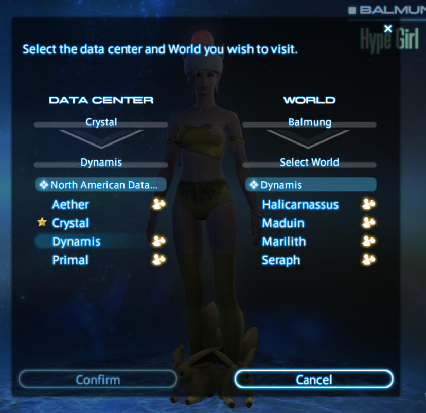 You are now ready to select another Data Center and World to visit! If the option is greyed out, you are either already in that Data Center, or the target world is having congestion and you will need to wait (or visit another World within that Data Center and World travel via the Aetheryte).
