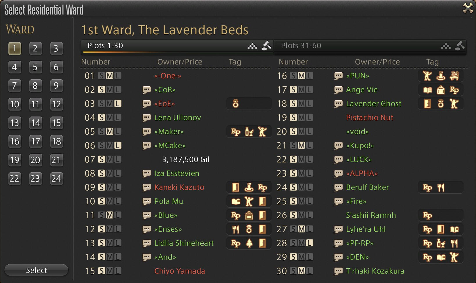 Data Center, World (Server), Housing District, Ward, PlotExample: Crystal, Balmung, Lavender Beds, W20, P30The Data Center may be omitted as well: Bal-LB-W20-P30Lodestone list of all Data Centers and WorldsCommon Housing District Abbreviations:
