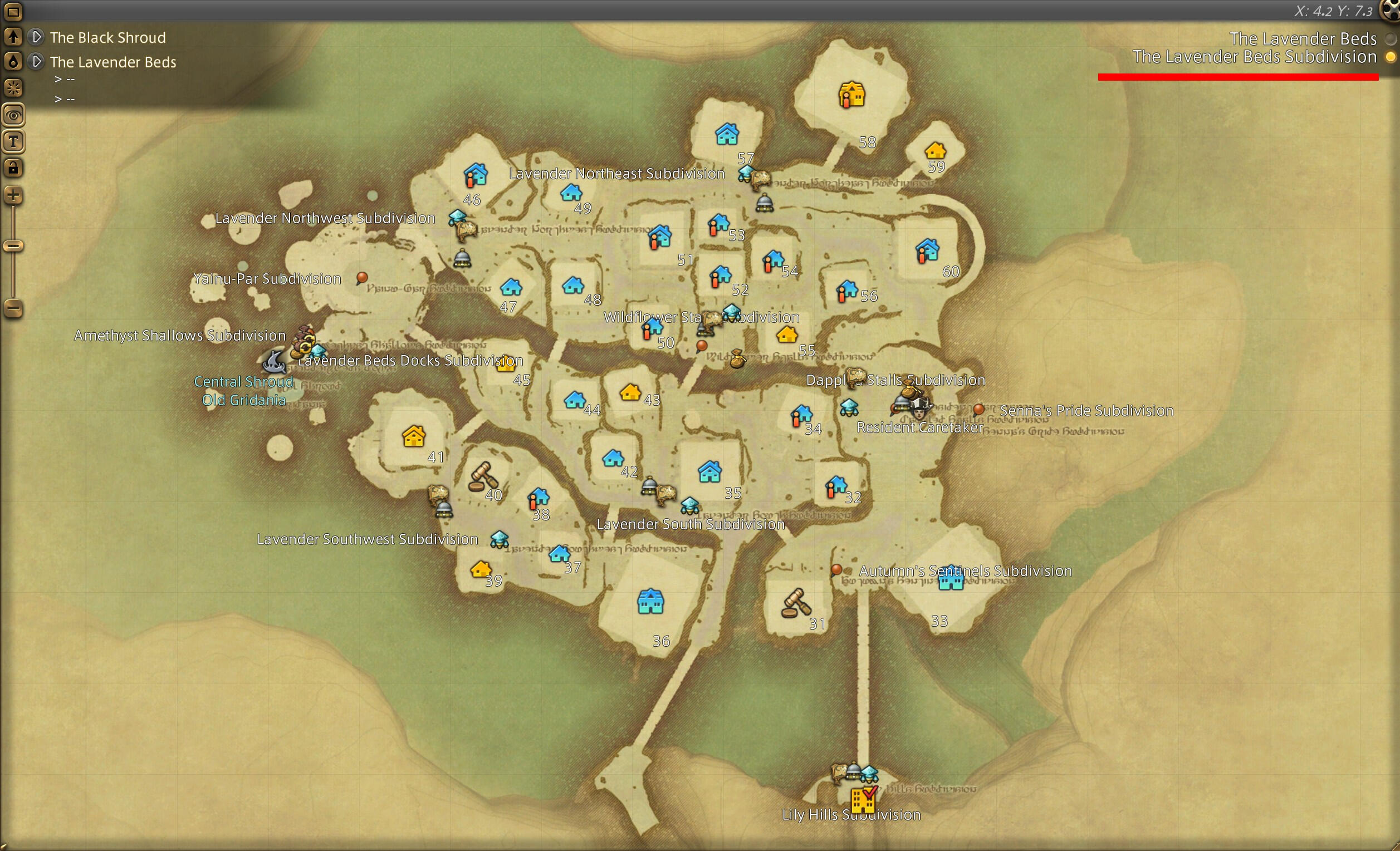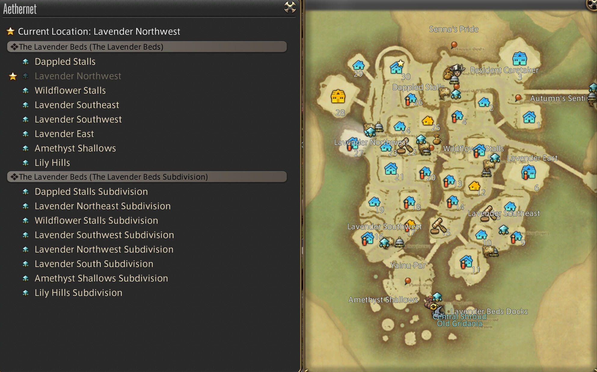 Once you have teleported to the correct ward, you will need to locate the plot. Plots 1-30 are in the primary residential area, plots 31-60 will be in the subdivision. Open your map ("m" default) and look for the plot number of the venue. Once found, note the closest Aethernet Shard. The toggle to view the subdivision is in the upper right of the map.