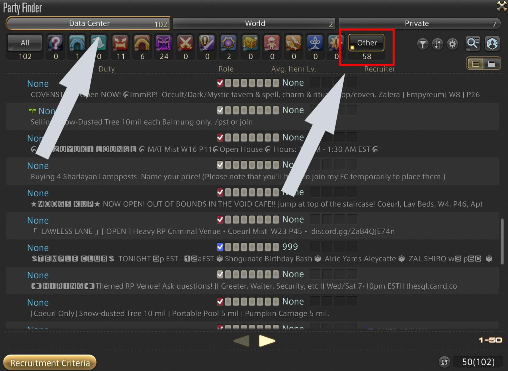 So, you want to go out tonight, but you aren't sure where to start. Maybe check with a friend or FC mate? Want to go it alone but have no idea what to look for or where to look?The community has you covered, as there are numerous promotions for various venues, some you may have seen such as town shouts, and others you may not know about, like the Party Finder "Other" tab...