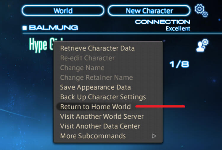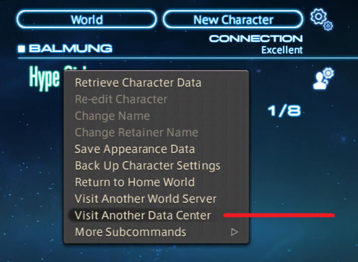 Once you have logged out of your Home World, right-click on your character name and select "Visit Another Data Center".