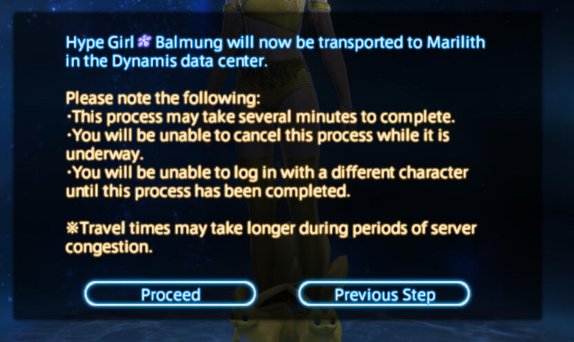 You will get a notice about traveling between Data Centers. The travel time is usually less than 1 minute, but it can take longer during periods of server congestion. Click "Proceed" to begin the process, after which, you will be able to login to the target World and venture forth within that Data Center!